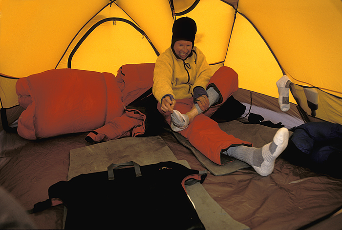 Bob Cochran switches into camp socks at the end of a travel day. Photo: Jerry Kobalenko