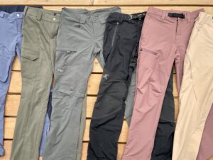 Several pair sof hiking pants are laid on the ground, with blue, green, grey, black, and pink pants overlapping each other.