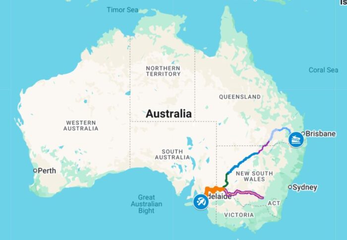 Davison’s vast route, including an out-and-back detour on the Murrumbidgee (purple line). Image: Alan Davison