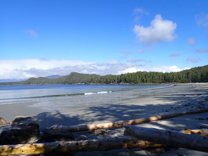 “I had to wait a few days of bad wind just out of Port Hardy before racing across Queen Charlotte Strait,” he recalled. “Once I reached Burnett Bay, I spent a few more days waiting for the next weather window. While on the beach at Burnett Bay, I got to enjoy the sight of a gale bringing huge swells crashing upon the beach. I was happy to look at those big waves from the safety of shore, and was appreciative that my landing and launch were both in waves of one meter or less.”