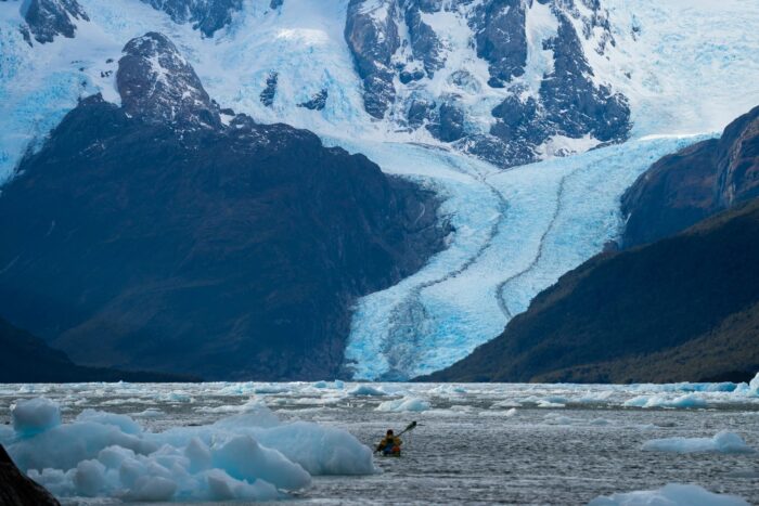 Before heading south, the team paddled north from Puerto Edén to the Pio Xi, the largest glacier in South America.