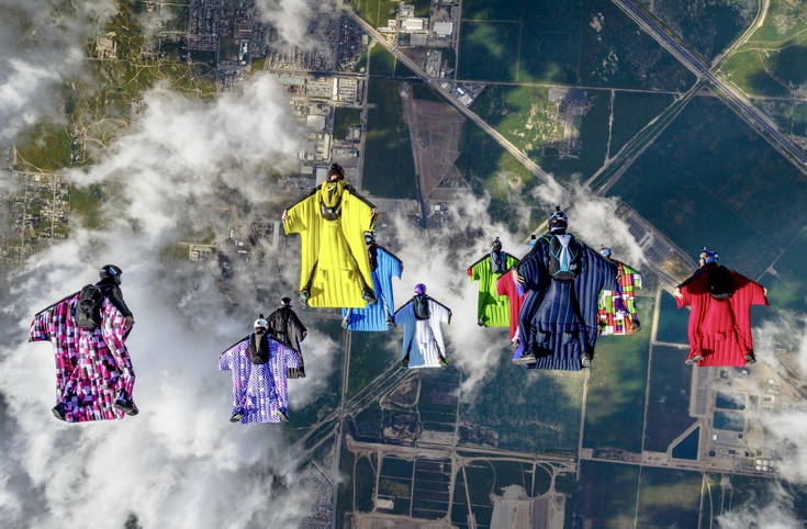 Colorful human bats flying in formation. Photo: Dan Dupuis/Squirrel