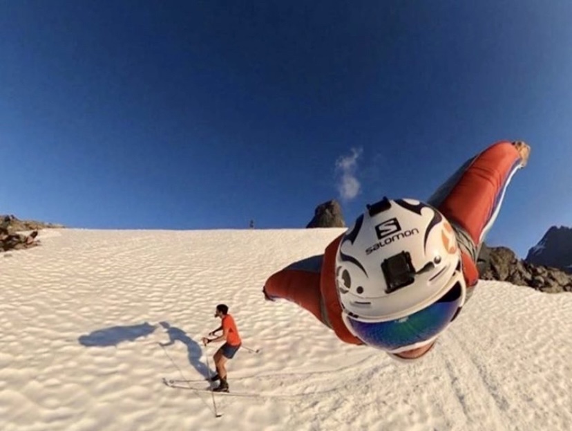 Norwegian BASE jumper, wingsuit flyer, and skier Tom Erik Heimen flies over trail runner and alpinist Kilian Jornet, who is skiing in shorts. Photo: Tom Erik Heimen